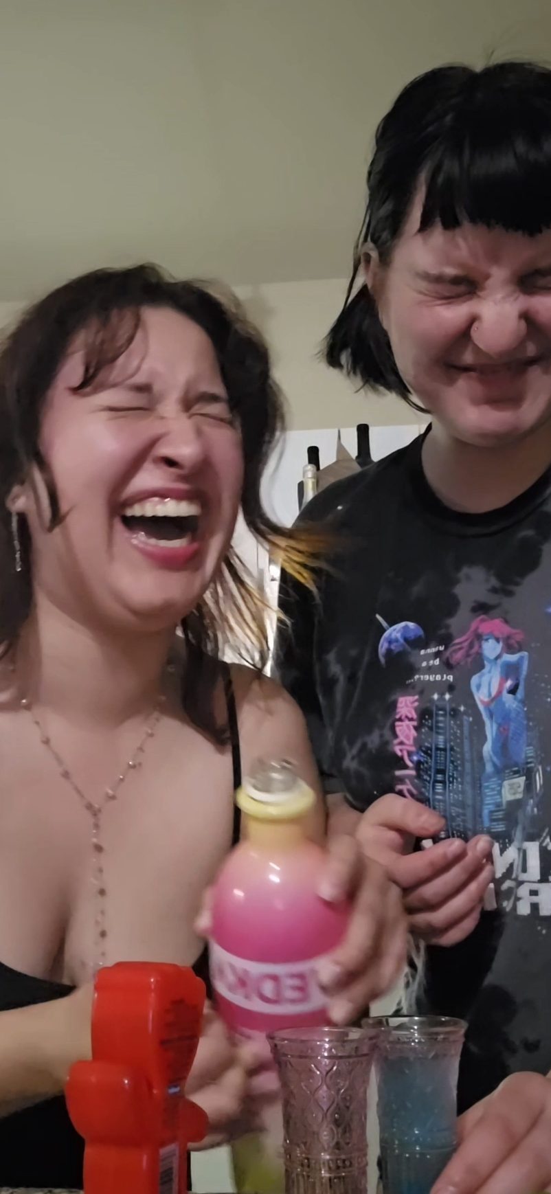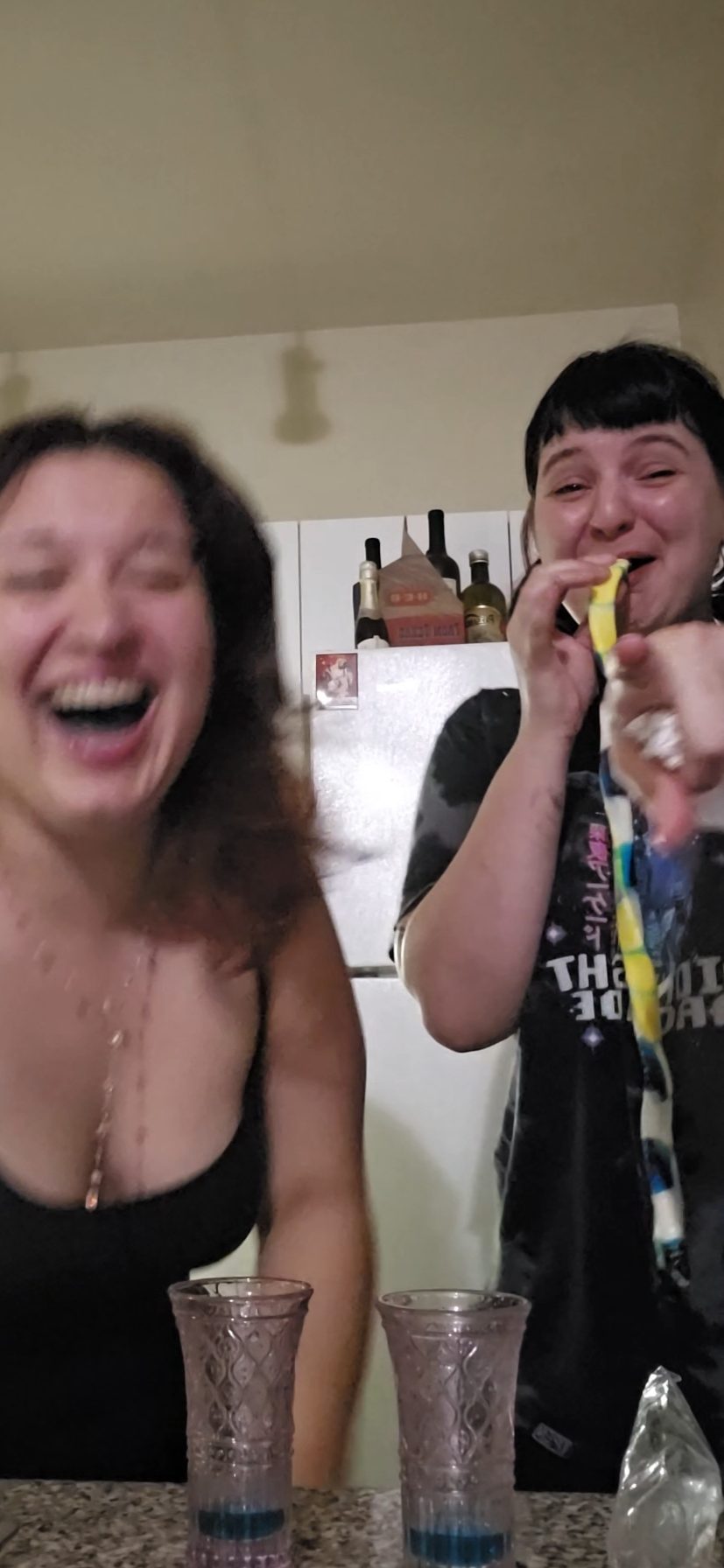 OF COURSE, I have to include this night. We picked up a bunch of snacks and candies to try from 5 Below, and ended up drinking while we tasted them. Before we drank though, I was singing the squid game oiia version song to Iris on the couch for I think 10 minutes because I felt silly. She kinda just stared but I got an occasional tail wag of course just because she was using a social fake ๐ we took several shots with like vodka and red and blue sour patch liquid candy, tried many gummies, and even a giant snake!! We didn’t do anything silly with the snake, that would be unexpected and inappropriate. Anyways, we had a silly time because we were in the silly room. There was no gay tension because that would be gay, but there was a giant gummy snake that was feeling gay because he was blue and yellow!